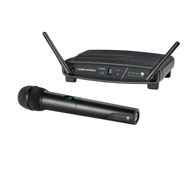 A handheld wireless system uses a dynamic microphone with a built-in transmitter. This results in a bigger, wider microphone than the typical wired model. We recommend the Audio-Technica System 10 ATW-1102 Digital Handheld Wireless System. This is a great system for performances in which the microphone needs to be mobile and is utilized by multiple singers or speakers during the performance.
