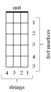 The picture below shows the numbered fret positions. Your fingers get applied to the fretboard on the spaces between the metal fret wires. The best position for your finger, if you’re asked to place it on “the first fret,” is actually between the nut and the first fret wire (closer to the wire). You should also know which finger gets what number. Beginning ukulele players will utilitze their first finger (pointer), second finger (middle) and third finger (ring). The pinkie will come into use as you begin playing more complicated pieces.