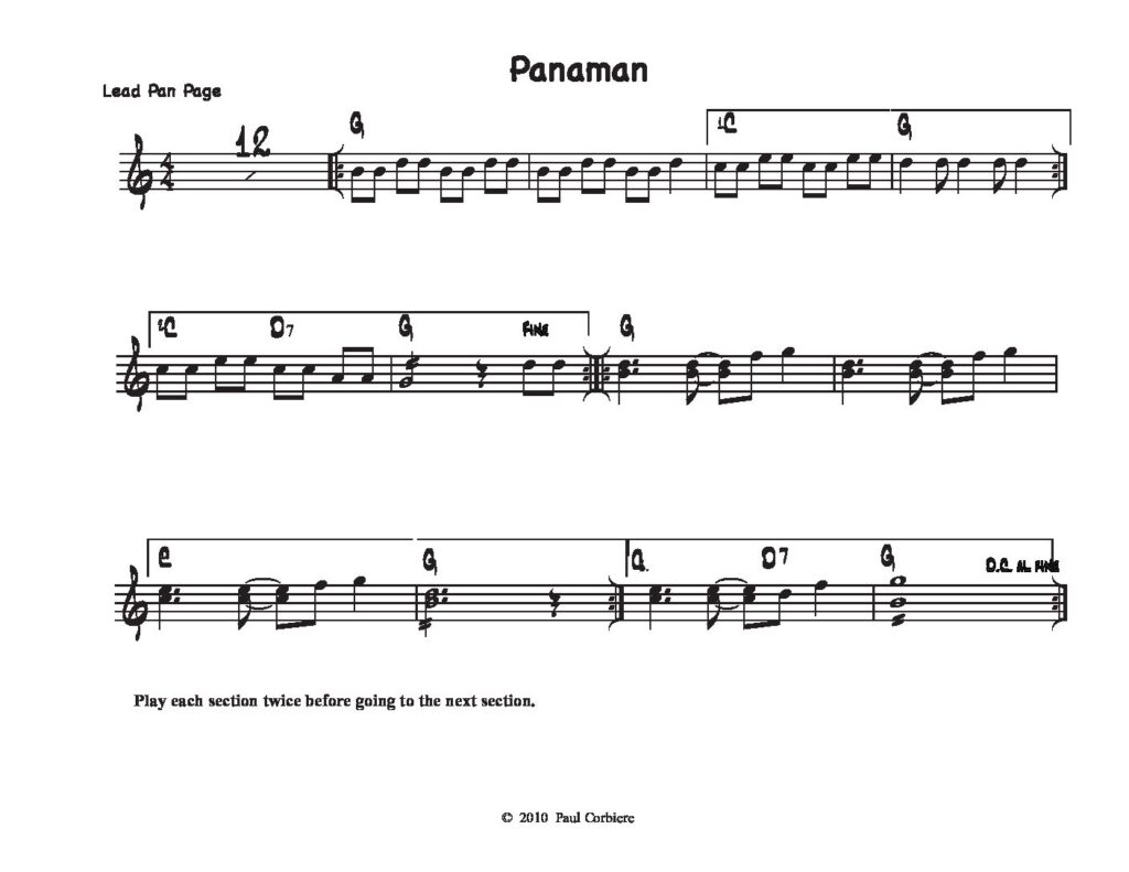 This piece, Panaman, allows for pan players to work on getting an even sound, hand to hand. Play the melody in the A section with doubles (two hits per hand – LL RR LL RR etc.). Initially, with younger players, teach this part as quarter-notes (one hit per hand). Then, as they gain confidence by knowing the melody, teach them to double these notes (eighth-notes). Players should listen for the second hit on each double to make sure that the hits are both even. You can create your own accompaniment to the melody by following the chord progression notated above the melody – like a lead sheet.