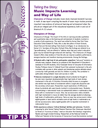 Champions of Change: The Impact of the Arts on Learning indicates that music study improved students’ success in math. Learn about how solid research proves that arts education has far-reaching benefits, both in and out of school, in this tip sheet, Telling the Story: Music Impacts Learning and Way of Life