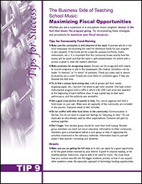 Whether you are a supervisor or a one-person music program, money is the fuel that keeps the program going.See some good ideas for maximizing your fiscal resources through community fund-raising, grants, important program practices and more in this tip sheet, The Business Side of Teaching School Music: Maximizing Fiscal Opportunities